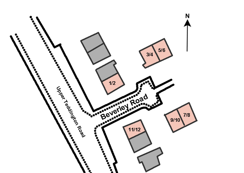 The Beverley Road development was built around 1960 by New Ideal Homes Ltd. The vacant site was created by demolishing two 1850’s properties. A total of 16 maisonettes/flats were built of which 12 were accessed from the newly-constructed Beverley Road, the remaining four having an Upper Teddington Road address.