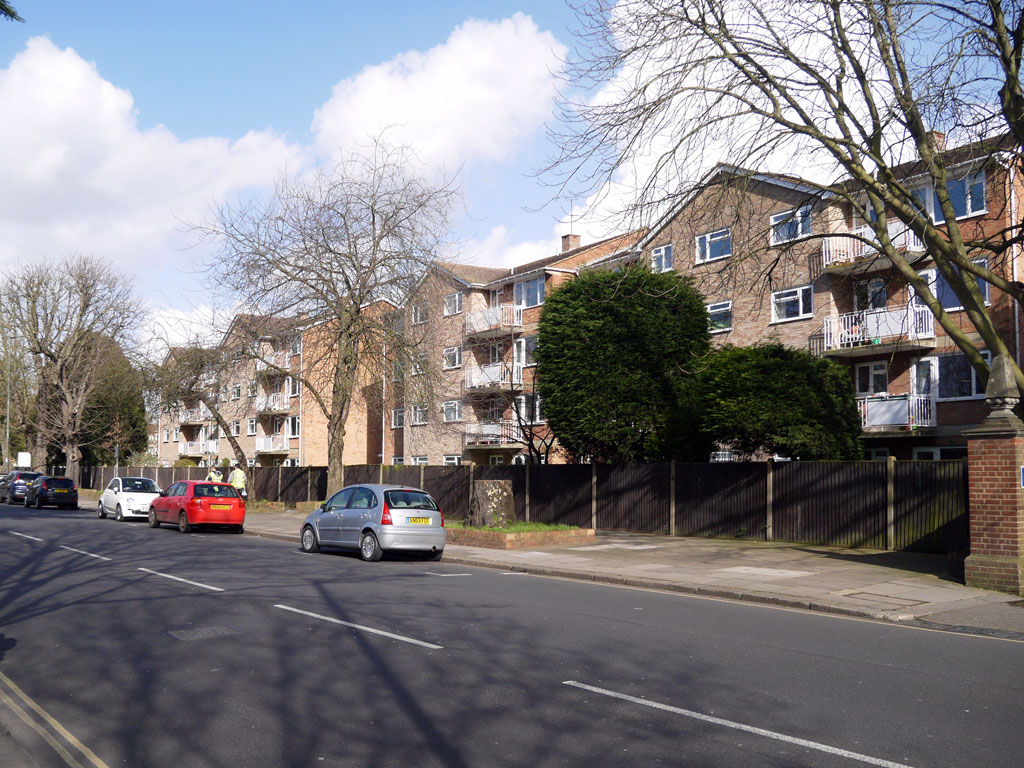 This development of 68 one- and two-bedroom flats was completed in the late 1960’s. Two properties (Egerton Lodge and Wordester House) were demolished to provide the vacant site. The link to the 1965 planning application shows an alternative scheme that would have used just the corner plot.